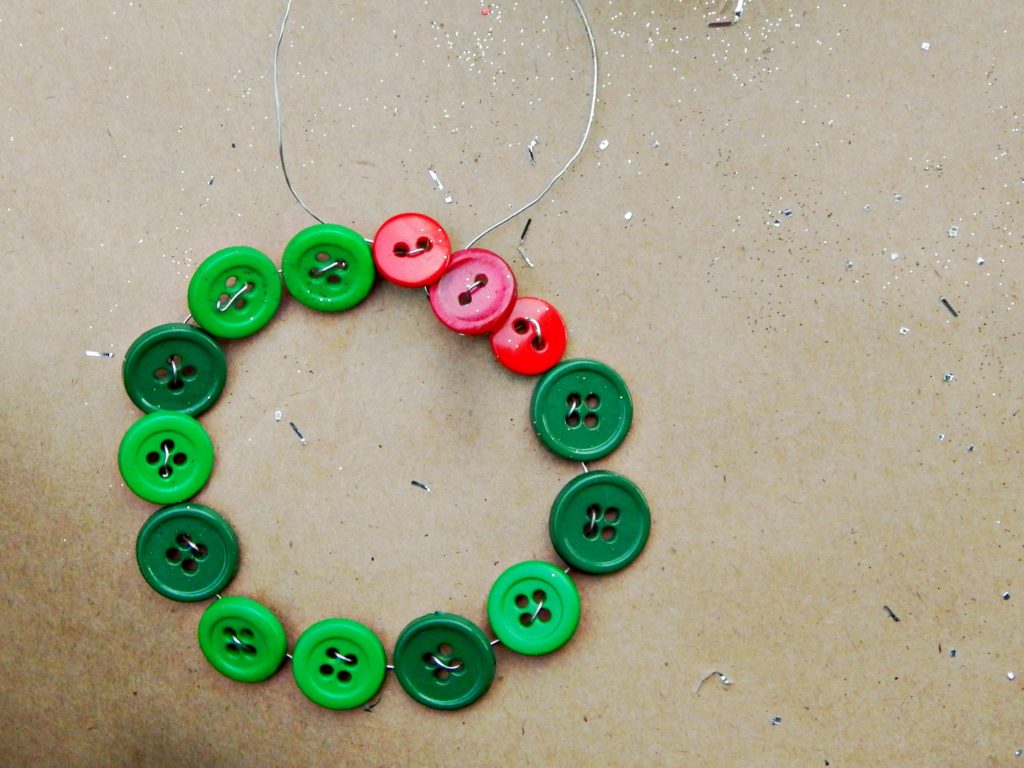 I made a little wreath out of green and red buttons and jewelry wire. Anika came up with a cute candy cane out of the same materials.
